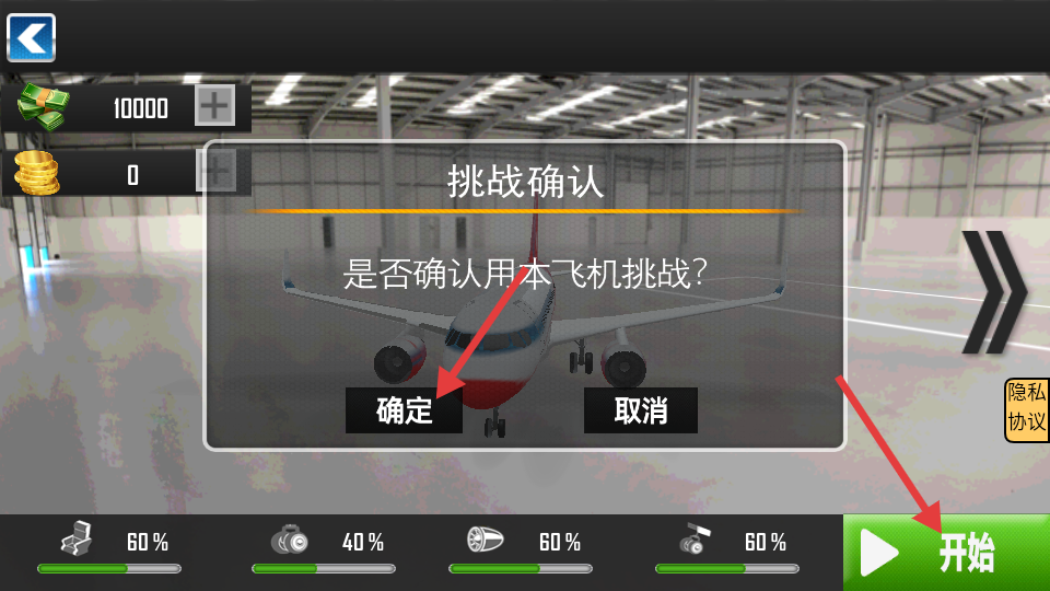 2、進(jìn)入飛機(jī)選擇界面,點(diǎn)擊開(kāi)始會(huì)彈出挑戰(zhàn)確認(rèn)窗口,詢問(wèn)玩家是否確認(rèn)用當(dāng)前飛機(jī)挑戰(zhàn),點(diǎn)擊確定確認(rèn)使用當(dāng)前飛機(jī)開(kāi)啟挑戰(zhàn)。
