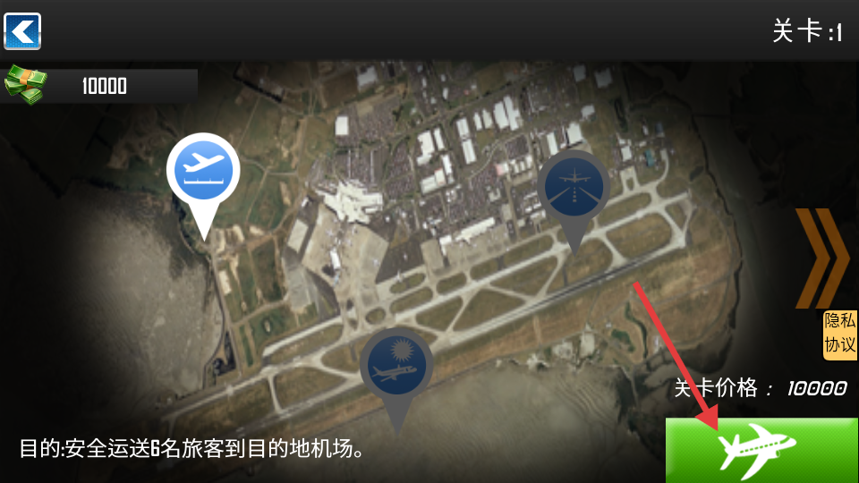 3、進(jìn)入關(guān)卡選擇界面,能看到地圖上標(biāo)注著不同的關(guān)卡點(diǎn),每個(gè)關(guān)卡都有相應(yīng)的任務(wù)說(shuō)明,選擇好關(guān)卡后點(diǎn)擊右下角綠色的飛機(jī)按鈕,支付對(duì)應(yīng)的關(guān)卡價(jià)格。