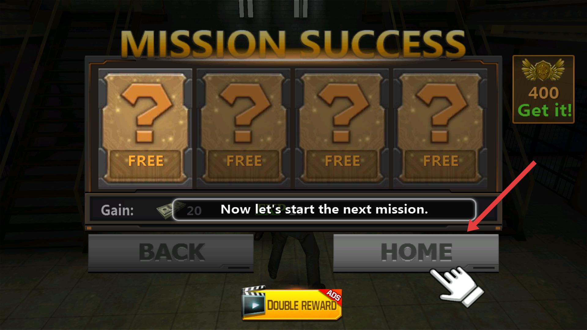 4、任務(wù)成功后,會顯示獎勵界面,可選擇【HOME】按鈕返回主界面,也可點(diǎn)擊相關(guān)選項(xiàng)開啟下一個任務(wù),繼續(xù)游戲挑戰(zhàn)。