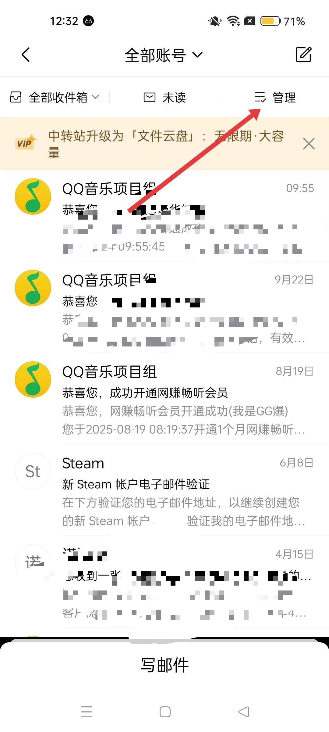 2、全部收件箱頁面點擊管理,進入郵件選擇界面,可對郵件進行批量操作。