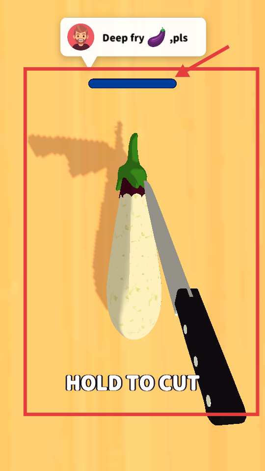 1、首先要處理食材,就像圖里的茄子,按照提示長(zhǎng)按進(jìn)行切割,把茄子處理成合適的形狀,為后續(xù)烹飪做準(zhǔn)備,這是制作垃圾食品的第一步。