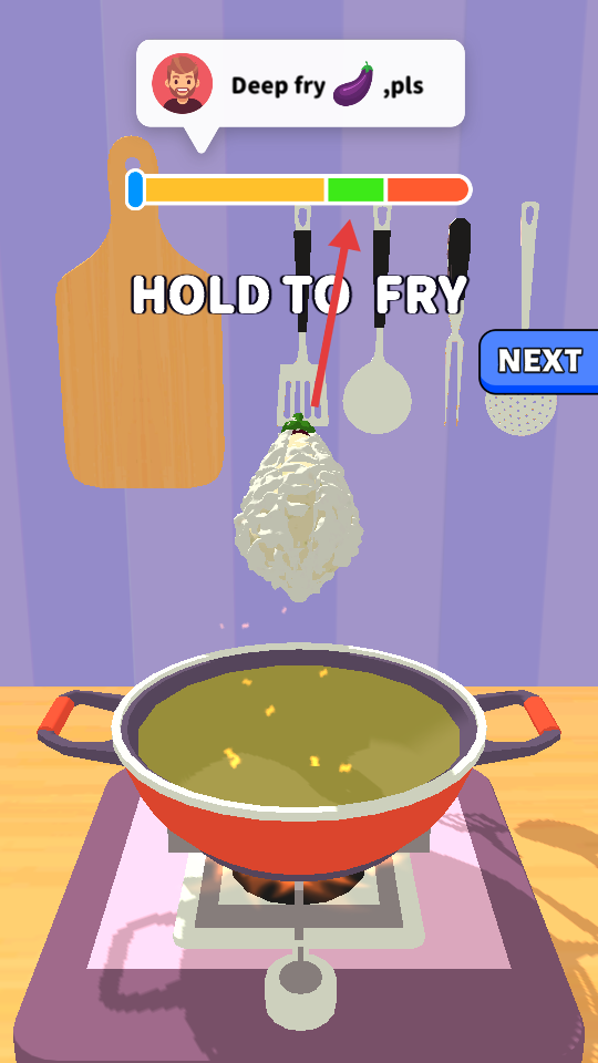 2、接著進(jìn)行油炸步驟,按照界面提示長(zhǎng)按操作讓處理好的食材,然后將茄子在油鍋里炸制,確保炸制在合適的區(qū)間,這樣能讓食材達(dá)到外酥里嫩的口感。