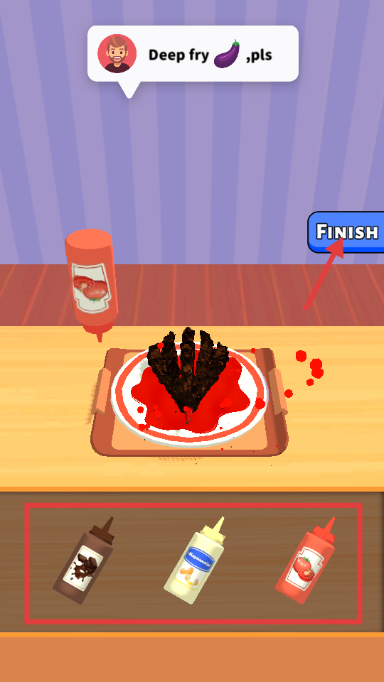 3、炸好食材后進(jìn)入調(diào)味裝盤環(huán)節(jié),可以選擇不同的醬料,玩家根據(jù)喜好搭配,然后將炸好的食材擺放在盤子里淋上醬料,最后點(diǎn)擊FINISH完成這一步。
