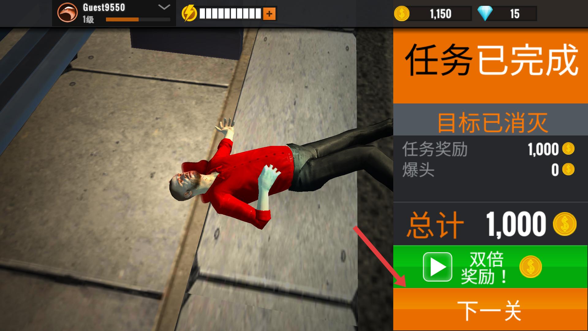 4、成功消滅目標(biāo)后,屏幕會(huì)顯示任務(wù)已完成,此時(shí)點(diǎn)擊【下一關(guān)】,就能繼續(xù)挑戰(zhàn)新的狙擊任務(wù)。