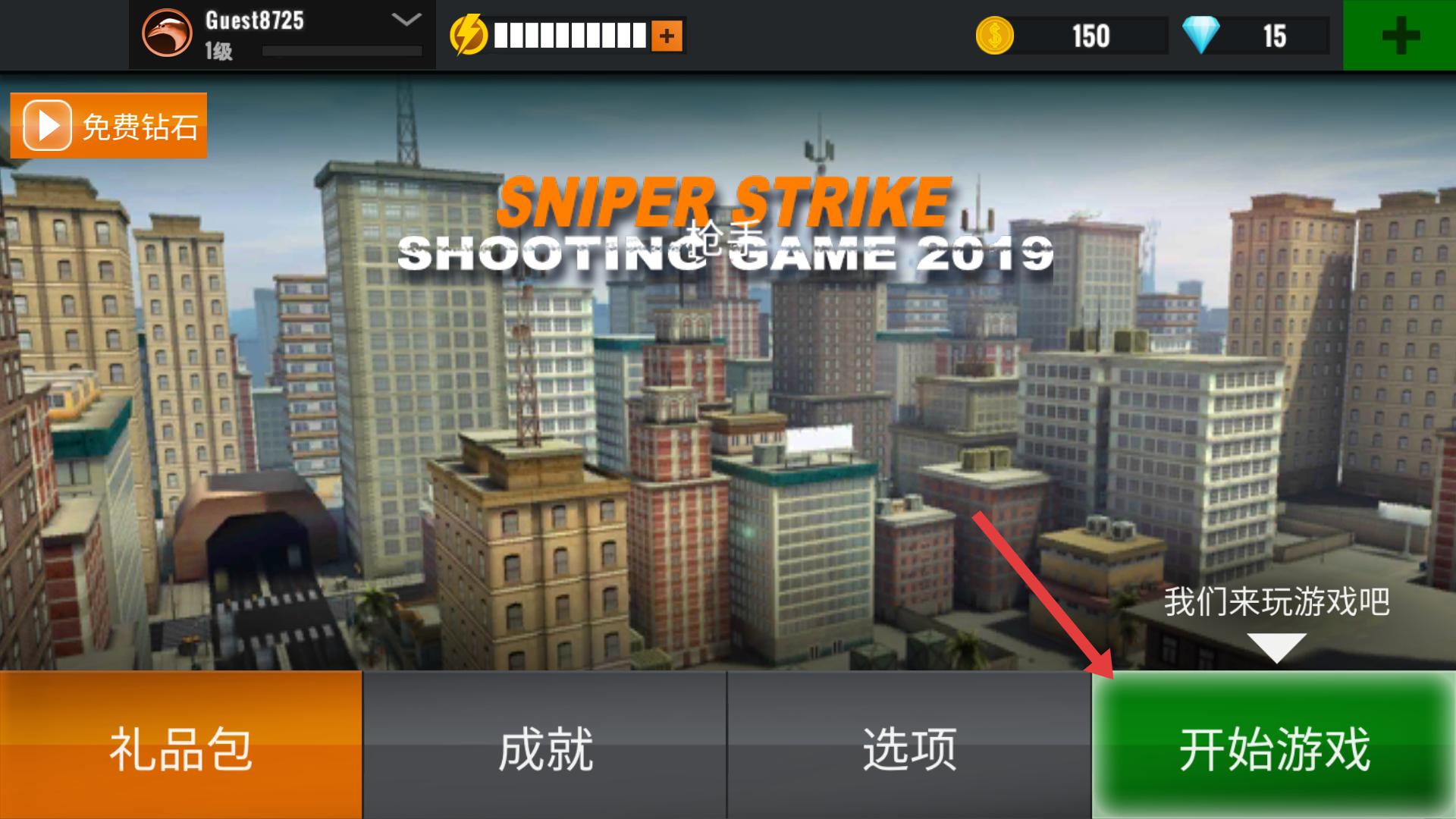 1、點(diǎn)擊【開(kāi)始游戲】,進(jìn)入游戲,準(zhǔn)備執(zhí)行狙擊任務(wù),開(kāi)啟在城市中的狙擊挑戰(zhàn)之旅。