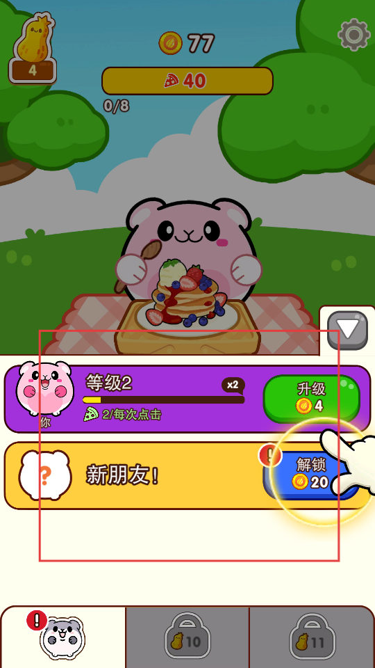 3、進(jìn)食積累足夠資源后,可升級角色,提升每次點(diǎn)擊的進(jìn)食效果,還能解鎖新朋友,豐富游戲體驗(yàn)。