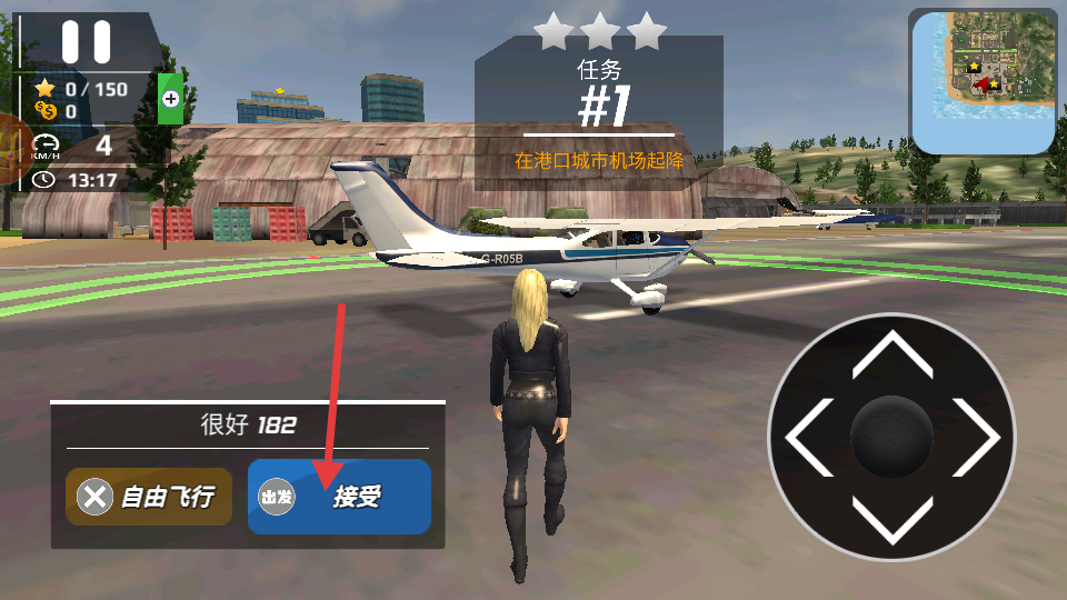3、走到飛機旁界面會彈出任務(wù)相關(guān)選項,點擊接受按鈕即可領(lǐng)取飛行任務(wù),比如在港口城市機場起降,明確飛行目標為駕駛飛機執(zhí)行任務(wù)做好準備。