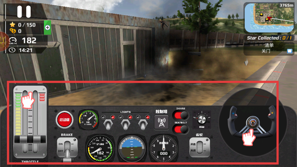 4、進入飛機駕駛艙,利用左側(cè)的油門控制桿調(diào)節(jié)動力,右側(cè)的方向盤操控飛行方向,還有各種儀表和按鈕輔助飛行操作,根據(jù)任務(wù)駕駛飛機起飛、飛行并完成起降等動作。