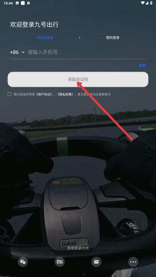 1、打開九號出行,進(jìn)入登錄頁面,輸入手機(jī)號后點(diǎn)擊獲取驗(yàn)證碼,開始登錄操作。