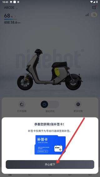 4、打開驚喜后,若獲得補(bǔ)簽卡,會有提示,點(diǎn)擊開心收下,即可領(lǐng)取補(bǔ)簽卡。