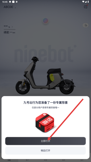 3、登錄成功后,可能會彈出九號出行為你準(zhǔn)備專屬驚喜的提示框,可選擇立即打開查看。
