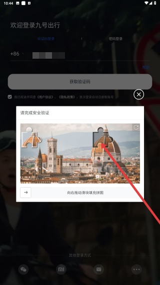 2、點(diǎn)擊獲取驗(yàn)證碼后,會彈出安全驗(yàn)證界面,需向右滑動(dòng)滑塊完成拼圖驗(yàn)證。