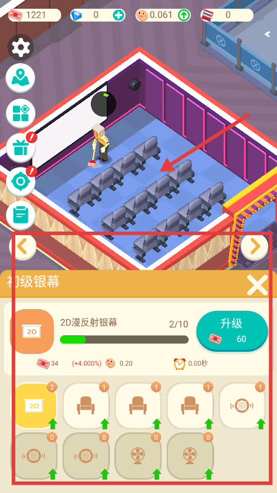 3、其次玩家可以升級影院設(shè)施,像升級初級銀幕等,可以提升觀影體驗,能吸引更多顧客增加收入。