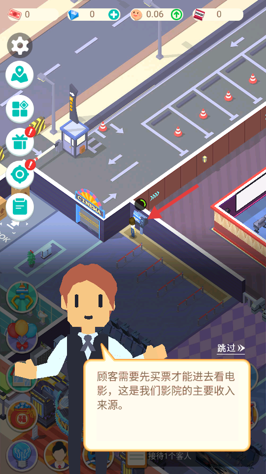 1、首先顧客看電影需先買票,這是影院主要收入來源,玩家需要引導(dǎo)顧客購票,購票是電影院主要收入。