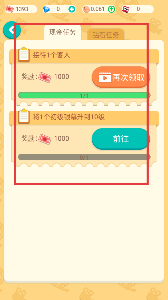 4、玩家還可以進入任務(wù)界面,完成現(xiàn)金任務(wù)比如接待客人、升級銀幕等,可獲得獎勵現(xiàn)金助力影院發(fā)展。