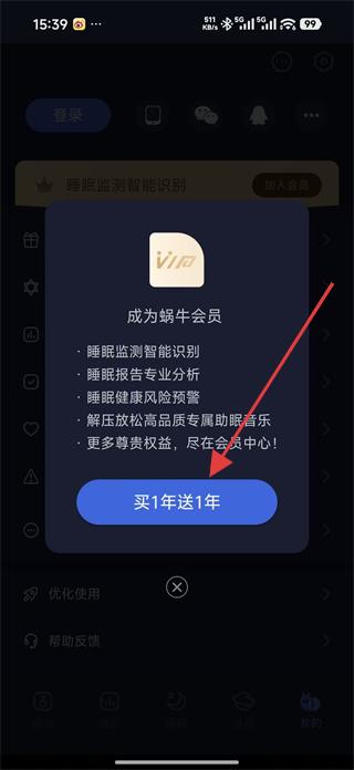 1、打開蝸牛睡眠app,在軟件會員推廣彈窗中點擊買1年送1年,點擊進(jìn)入會員中心頁面。