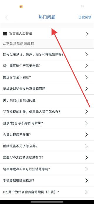 4、進(jìn)入熱門問題頁面瀏覽如何記錄夢話、蝸牛睡眠產(chǎn)品是否安全等常見問題解答,還可留言給人工客服咨詢其他問題。