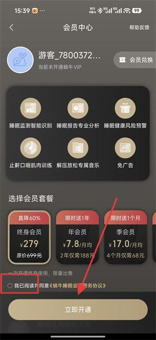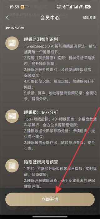 3、在會員權(quán)益說明頁面查看睡眠監(jiān)測智能識別、睡眠報告專業(yè)分析等會員權(quán)益后,點擊立即開通,完成會員開通操作。