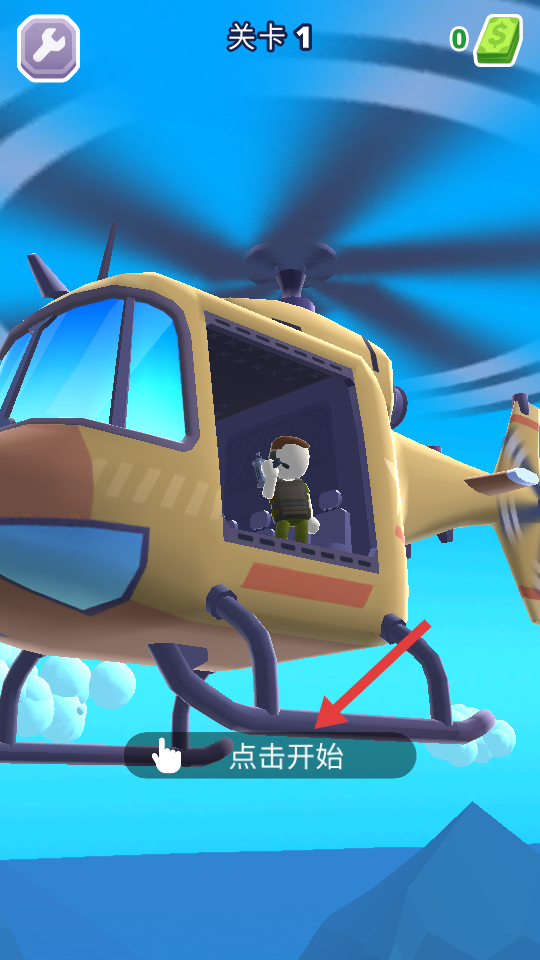 1、玩家進(jìn)入游戲即可到關(guān)卡1,點(diǎn)擊點(diǎn)擊開始按鈕即可開啟游戲,開啟后角色會(huì)乘直升機(jī)準(zhǔn)備執(zhí)行任務(wù)。