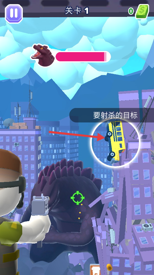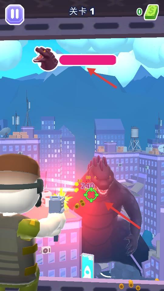 2、玩家開始游戲后,會(huì)看到怪獸出現(xiàn)在城市中,拿起槍瞄準(zhǔn)怪獸射擊,屏幕上會(huì)顯示傷害數(shù)值,同時(shí)注意怪獸上方的血條變化。