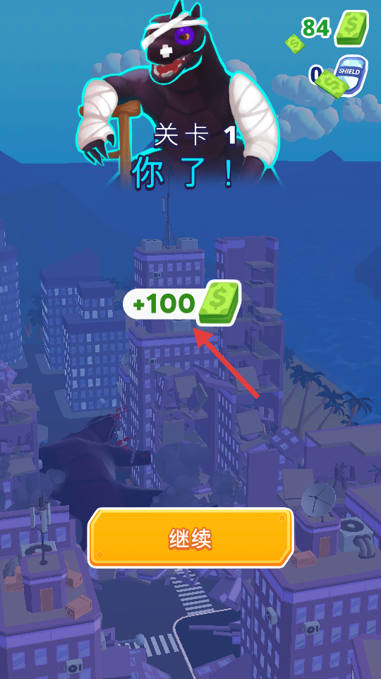 4、玩家成功擊敗怪獸后,會(huì)獲得美元獎(jiǎng)勵(lì),然后點(diǎn)擊繼續(xù)按鈕,可進(jìn)入后續(xù)游戲環(huán)節(jié),開始新的打怪獸旅程。