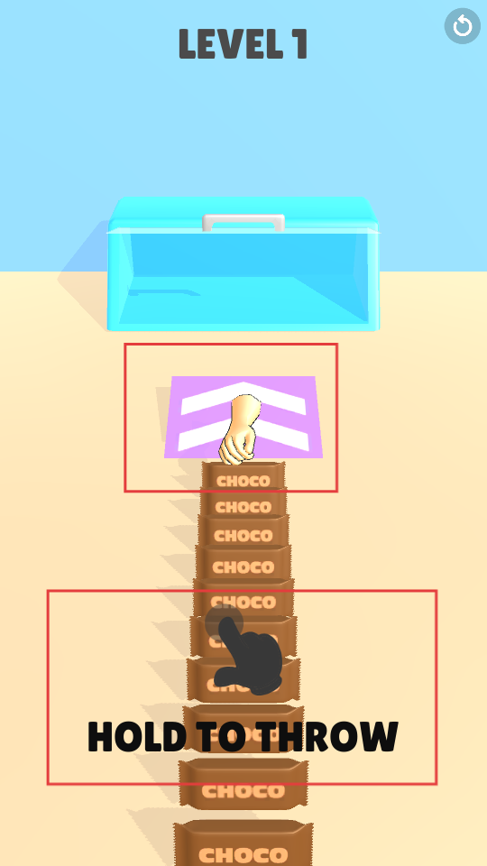1、按住巧克力,調(diào)整好角度和力度,將其投擲出去,讓巧克力準(zhǔn)確落入上方的容器中,開始收集巧克力。