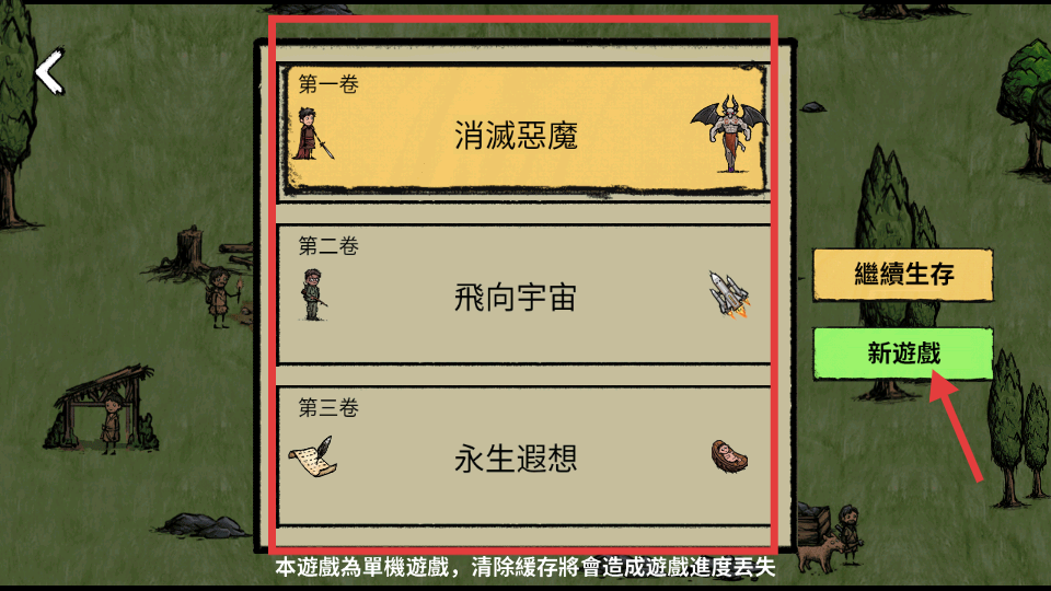 1、游戲主界面點(diǎn)擊開(kāi)始游戲,進(jìn)入游戲選擇界面,這里有第一卷、第二卷、第三卷等不同章節(jié),可根據(jù)喜好選擇若想重新開(kāi)始,點(diǎn)擊新游戲即可開(kāi)啟冒險(xiǎn)。