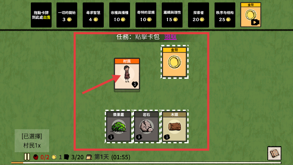 4、游戲里點(diǎn)擊卡包可獲得村民、金幣等資源卡牌,村民是建設(shè)村莊的關(guān)鍵,金幣用于購(gòu)買(mǎi)卡牌等,合理管理這些資源和村民,是推動(dòng)村莊發(fā)展的核心。