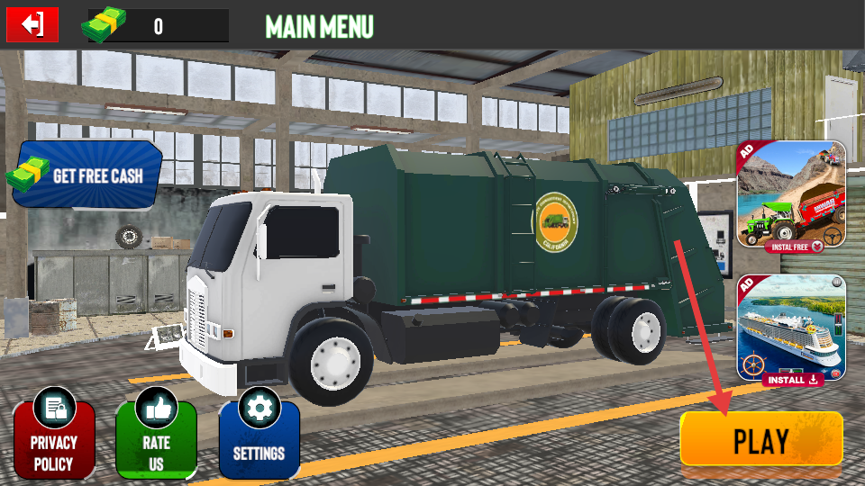 1、打開歐洲垃圾車模擬器,主界面點(diǎn)擊PLAY進(jìn)入游戲,這里可看到車庫中的垃圾車,還有GET FREE CASH等獲取資金的選項(xiàng),為游戲操作和設(shè)置提供入口。