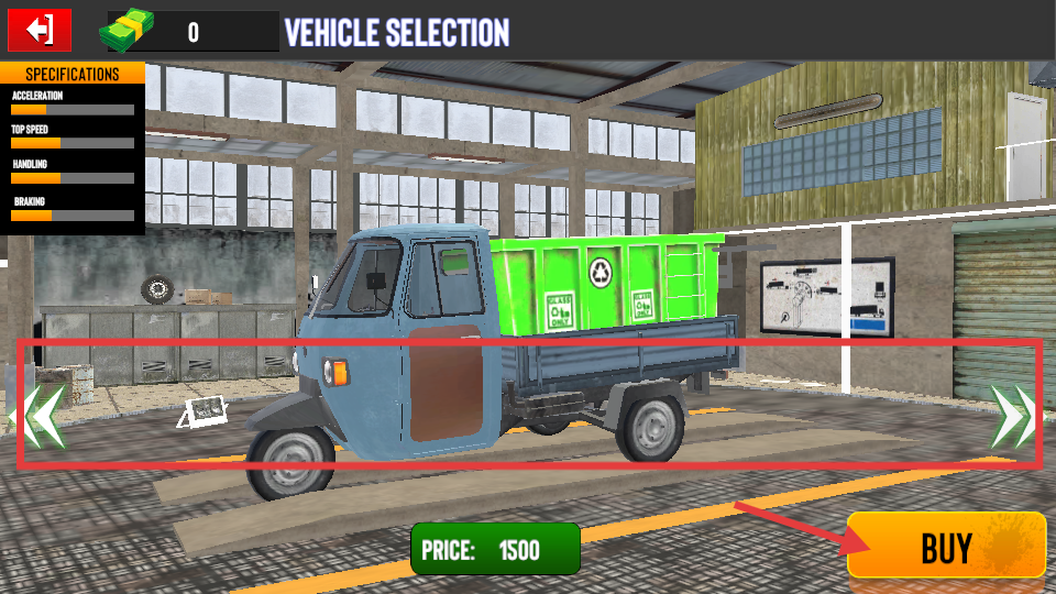 2、進(jìn)入車輛選擇界面,能查看不同垃圾車的加速、最高速度、操控、剎車等性能參數(shù),玩家可點(diǎn)擊BUY購買,選擇合適的垃圾車能讓后續(xù)垃圾運(yùn)輸更高效。