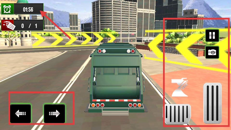 4、進(jìn)入游戲后通過左側(cè)按鈕控制垃圾車轉(zhuǎn)向、右側(cè)控制車速,界面上方顯示時(shí)間和需收集的垃圾數(shù)量,要在規(guī)定時(shí)間內(nèi),行駛到指定地點(diǎn)收集垃圾完成運(yùn)輸任務(wù)。