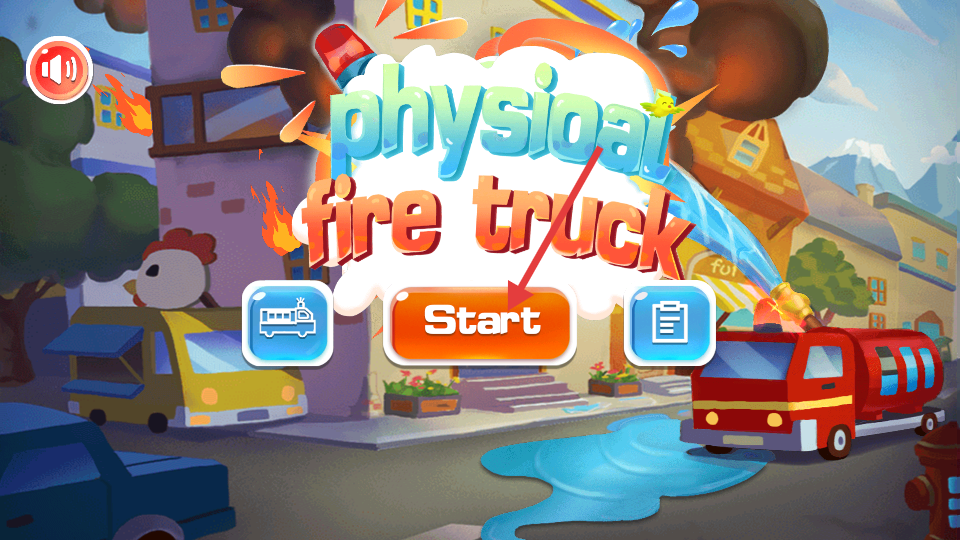 1、打開消防車模擬救火游戲,主界面點擊Start按鈕即可進(jìn)入游戲,此時能看到火災(zāi)場景和消防車,為后續(xù)的救火操作做好準(zhǔn)備,開啟模擬救火的體驗。