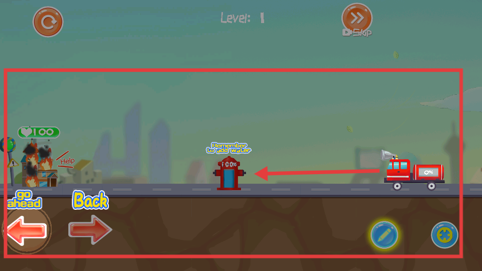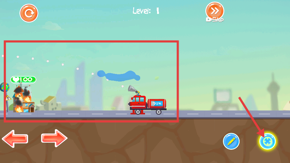 3、點擊右側(cè)的噴水按鈕,消防車就會向著火的建筑噴水,持續(xù)噴水能逐漸撲滅大火,在噴水過程中要注意調(diào)整消防車位置,玩家要確保滅火效果。