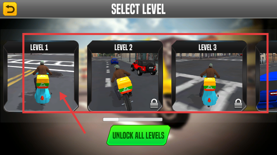 1、進入游戲首先要選擇關(guān)卡,界面會展示LEVEL1、LEVEL2、LEVEL3等不同關(guān)卡,初始可選擇LEVEL1開始游戲,后續(xù)關(guān)卡需解鎖,選好關(guān)卡就能進入對應(yīng)的送貨場景。