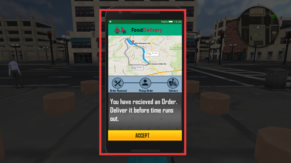 3、游戲中會彈出訂單提示界面顯示收到訂單,需要在時間耗盡前送達,點擊ACCEPT按鈕即可接受訂單,此時要記住訂單的配送要求和時間限制。