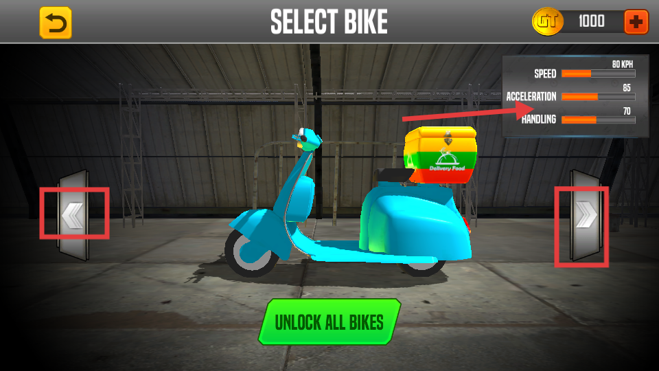 2、在選車界面能看到不同的摩托車,還有速度、加速度、操控性等性能參數(shù),通過左右箭頭按鈕可切換查看摩托車,挑選適合自己為接單送貨做好準備。
