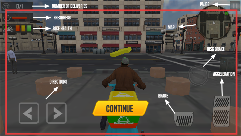 4、接受訂單后進入送貨操作界面,這里有送貨數(shù)量、食物新鮮度、摩托車健康度等提示,還有地圖、加速、剎車等操作按鈕,根據(jù)方向提示操控摩托車前往取貨和送貨地點。
