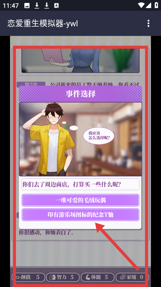 4、在與攻略對象互動過程中會遇到事件選擇,比如去周邊商店買東西,有不同的選項供玩家選擇,不同選擇會影響后續(xù)劇情發(fā)展和與攻略對象的關(guān)系,玩家需謹慎抉擇。
