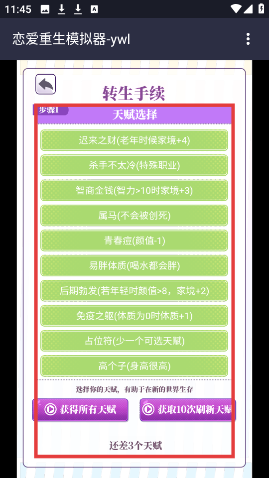 1、首先進行天賦選擇,這里有多種天賦,選擇合適天賦有助于在新世界更好生存,還能通過獲得所有天賦或獲取10次刷新天賦來豐富天賦選擇。