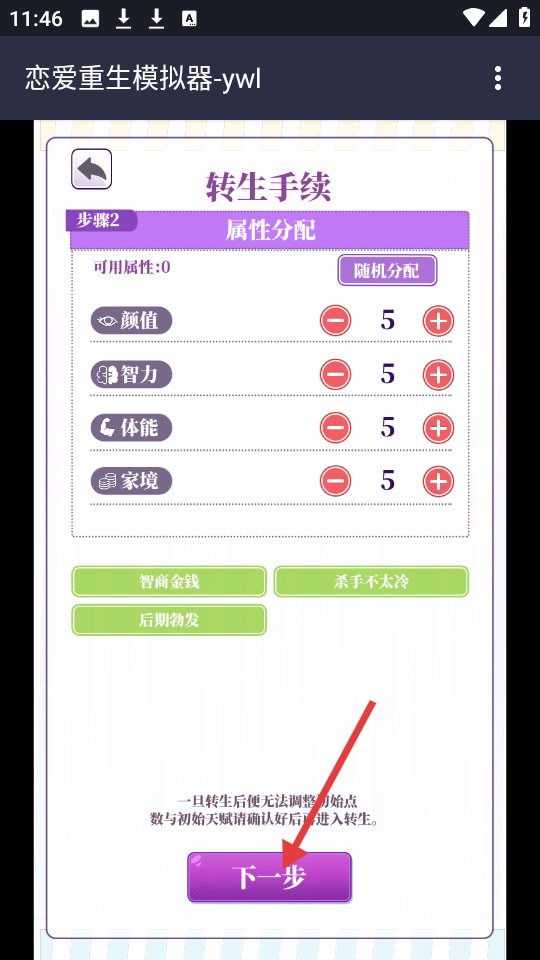 2、接著進行是屬性分配,可對顏值、智力、體能、家境這幾個屬性進行調(diào)整,通過加減按鈕增減數(shù)值,屬性分配好后確認天賦,點擊下一步即可進入轉(zhuǎn)生環(huán)節(jié)。