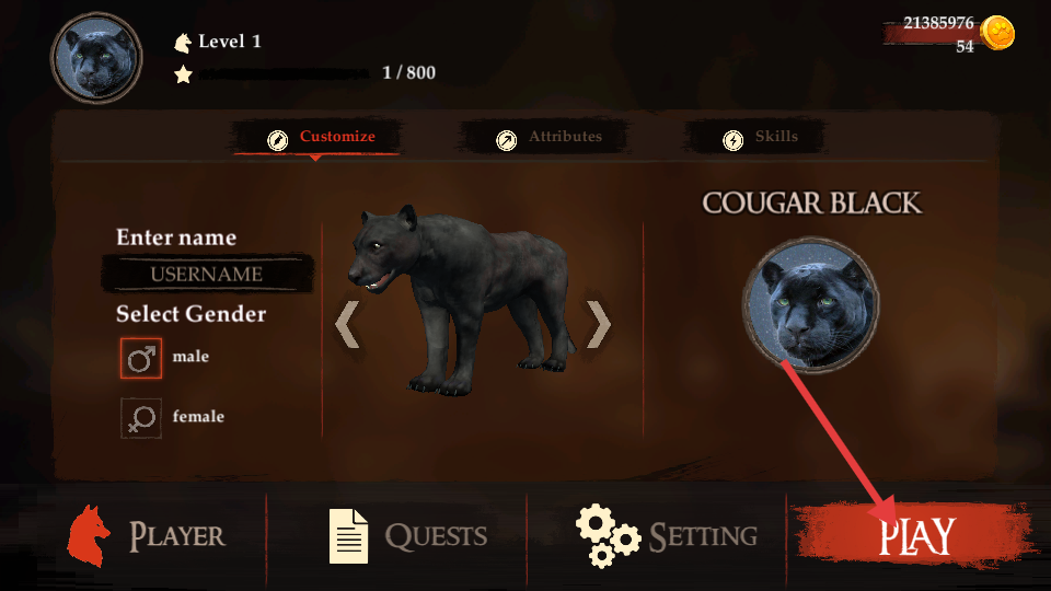 2、進入角色創(chuàng)建界面,可輸入用戶名、選擇豹子的性別,還能對豹子外觀等進行定制,設(shè)置好后點擊PLAY,就能以創(chuàng)建好的豹子角色進入游戲世界。