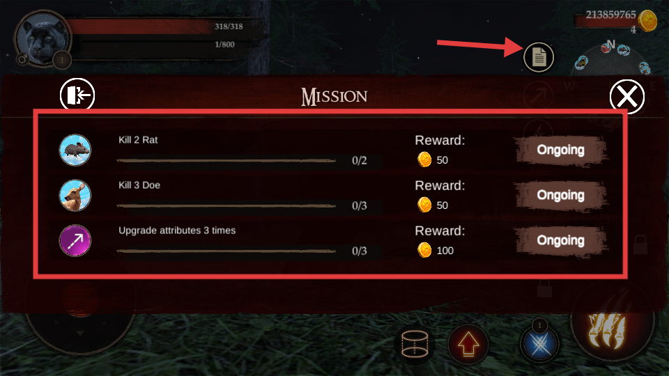 4、點擊右側(cè)任務(wù)圖標(biāo)會彈出任務(wù)界面,里面有諸如擊殺老鼠、鹿,升級屬性等任務(wù),完成任務(wù)可獲得金幣獎勵,通過完成這些任務(wù),能提升豹子的能力。