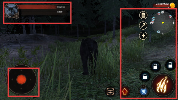 3、游戲場景中左側(cè)的虛擬搖桿用于控制豹子移動,探索森林等環(huán)境,上方顯示豹子的生命值等狀態(tài)信息,右側(cè)有地圖、技能等功能按鈕,可查看方位、使用技能。