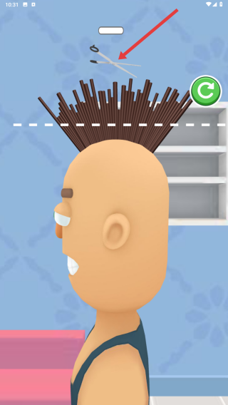 1、進入游戲,面對有豎起頭發(fā)的人物,使用剪刀工具,按照虛線位置修剪頭發(fā),打造初步發(fā)型。