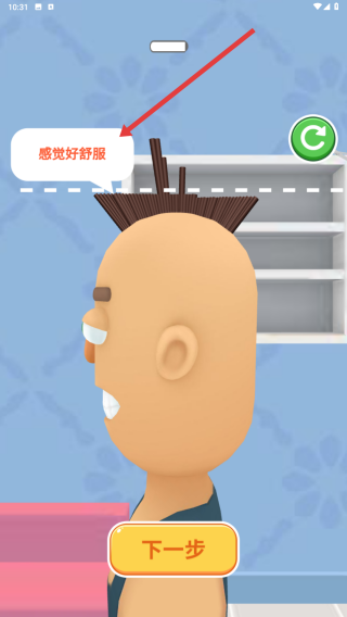 2、頭發(fā)修剪到合適長度,人物會出現(xiàn)感覺好舒服的反饋,此時可點擊下一步繼續(xù)操作。