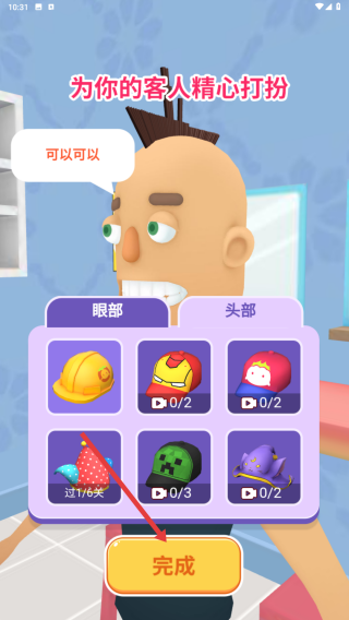 3、進入裝扮界面,從眼部、頭部等分類中挑選帽子等配飾,為人物精心打扮,完成后點擊完成。