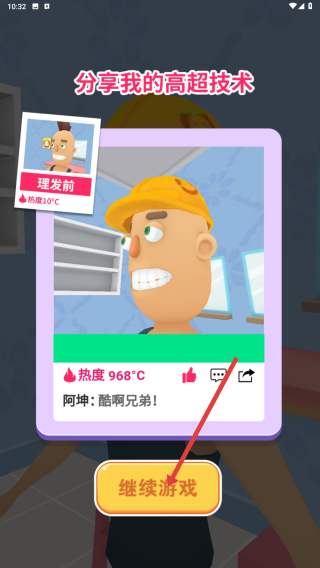 4、造型結(jié)束會生成包含熱度等數(shù)據(jù)的展示界面,可分享成果,之后點擊繼續(xù)游戲開啟新造型。