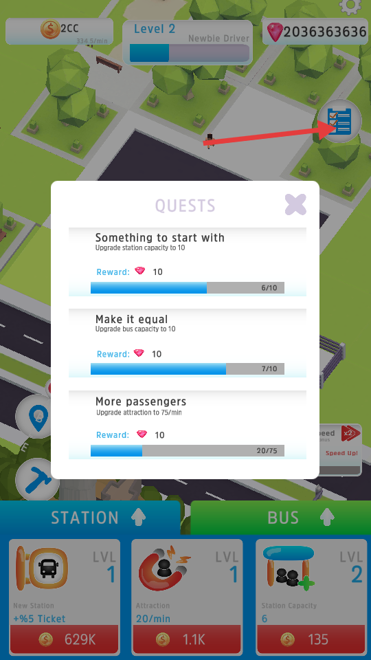 3、點(diǎn)擊右上角任務(wù)圖標(biāo)查看任務(wù)列表,像升級(jí)車站容量、巴士容量等任務(wù),完成這些任務(wù)可獲得鉆石等獎(jiǎng)勵(lì),同時(shí)推動(dòng)游戲進(jìn)程,逐步滿足前往下一個(gè)地圖的任務(wù)要求。
