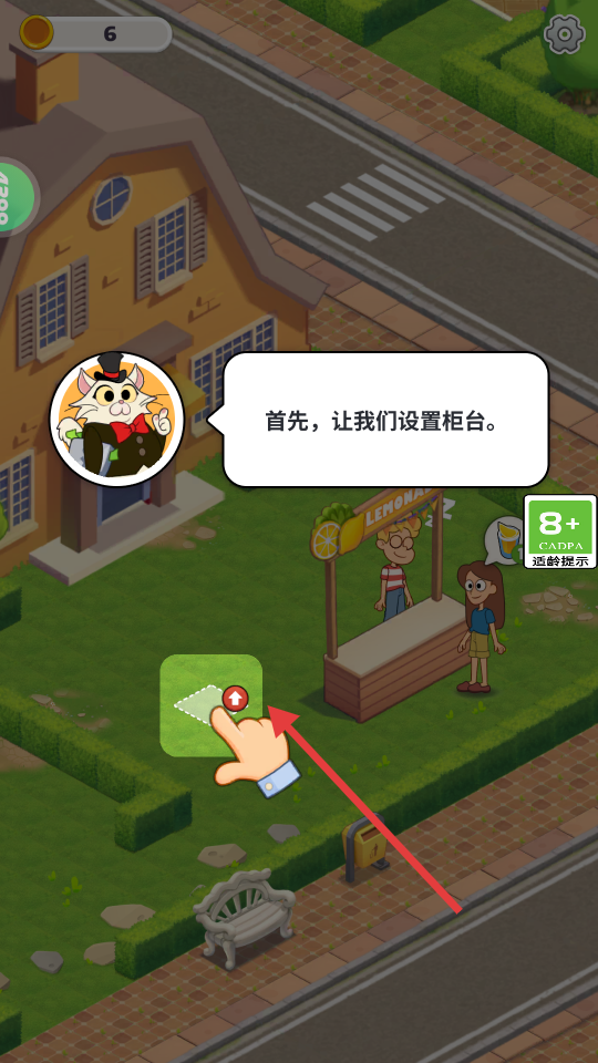 1、首先會有引導(dǎo)提示設(shè)置柜臺,按照指引點擊指定的綠色區(qū)域,就能完成柜臺的初始布置,這是開啟小吃攤經(jīng)營的第一步。