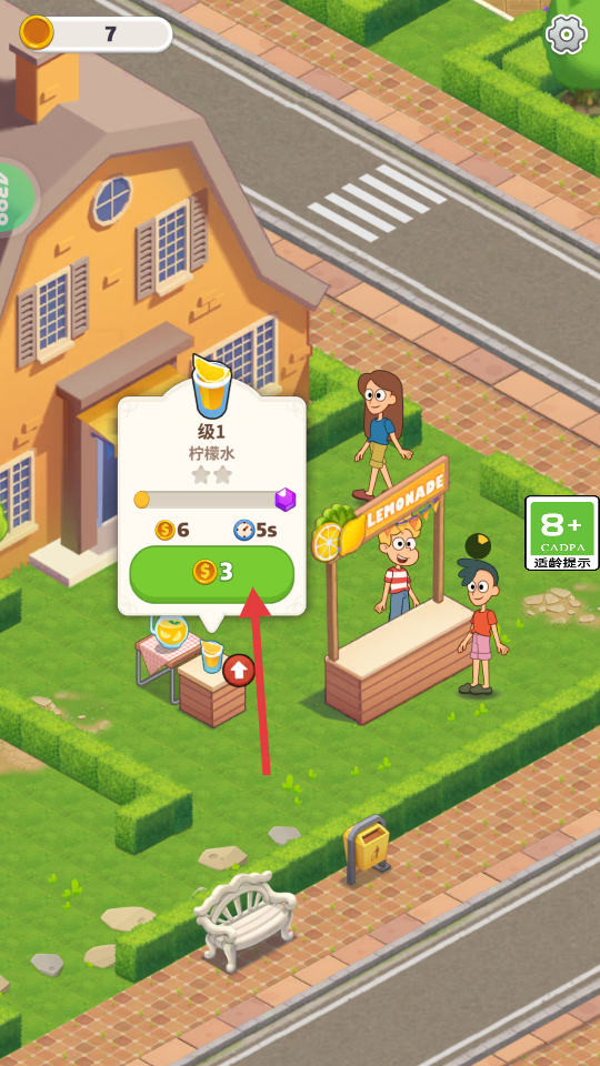 4、隨著售賣檸檬水獲得金幣,當(dāng)積累到一定數(shù)量,就會出現(xiàn)升級提示界面,點擊綠色的升級按鈕,可對檸檬水制作或攤位進(jìn)行升級,升級后能提高制作效率、增加收益。